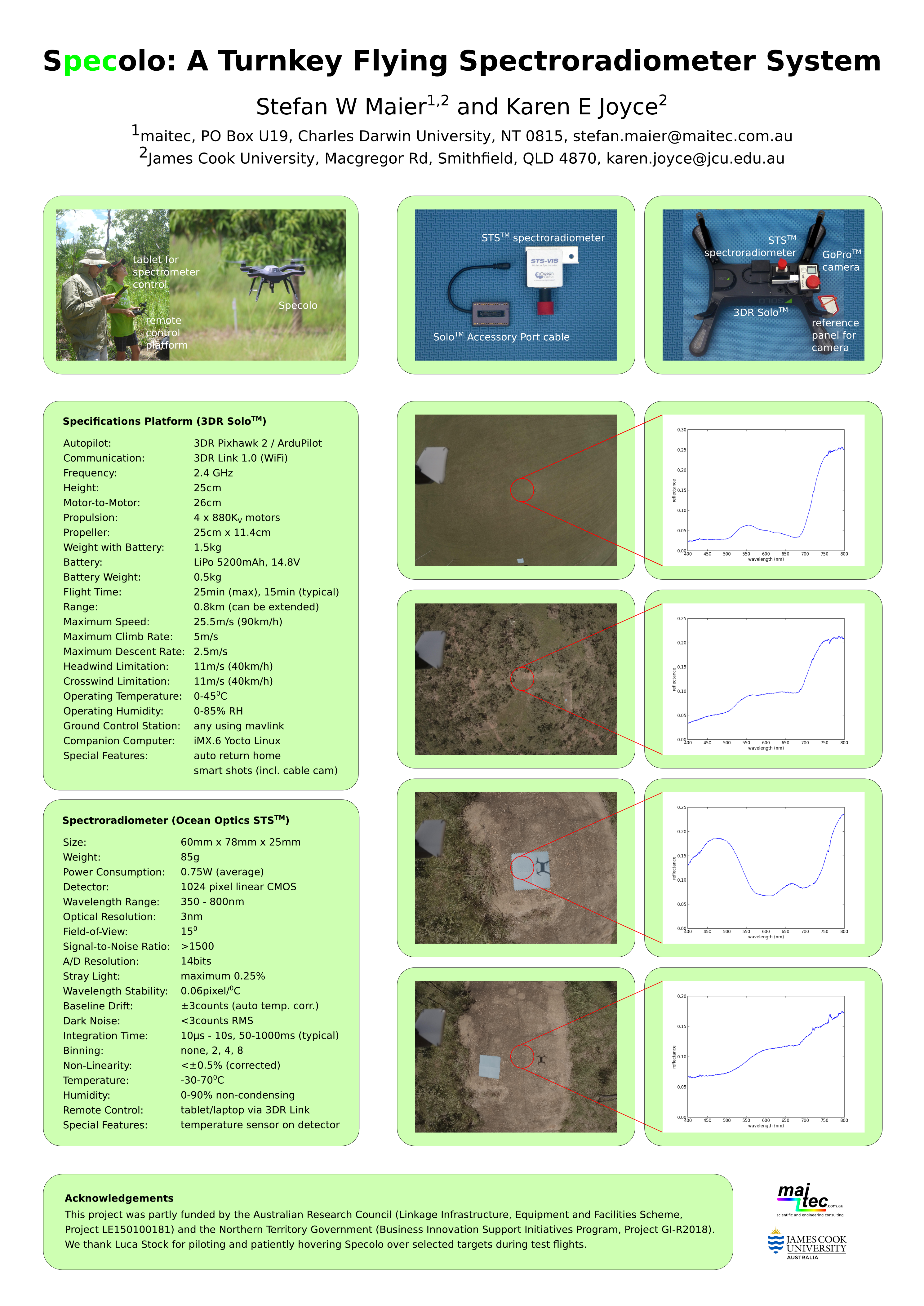 Specolo is an integrated system consisting of an unmanned aerial platform, incl. remote control and a spectrometer module. Full in-flight control over the spectrometer is given via a laptop or tablet computer through the standard radio link. This plug-and-fly ability lets the user focus on the application without having to worry about engineering details. Its ease of use provides the potential for application by non-remote sensing and engineering experts like farmers, land managers, park rangers and environmental consultants.
